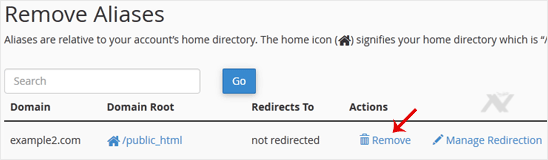 Under Remove Aliases, locate the parked domain name and click on Remove.